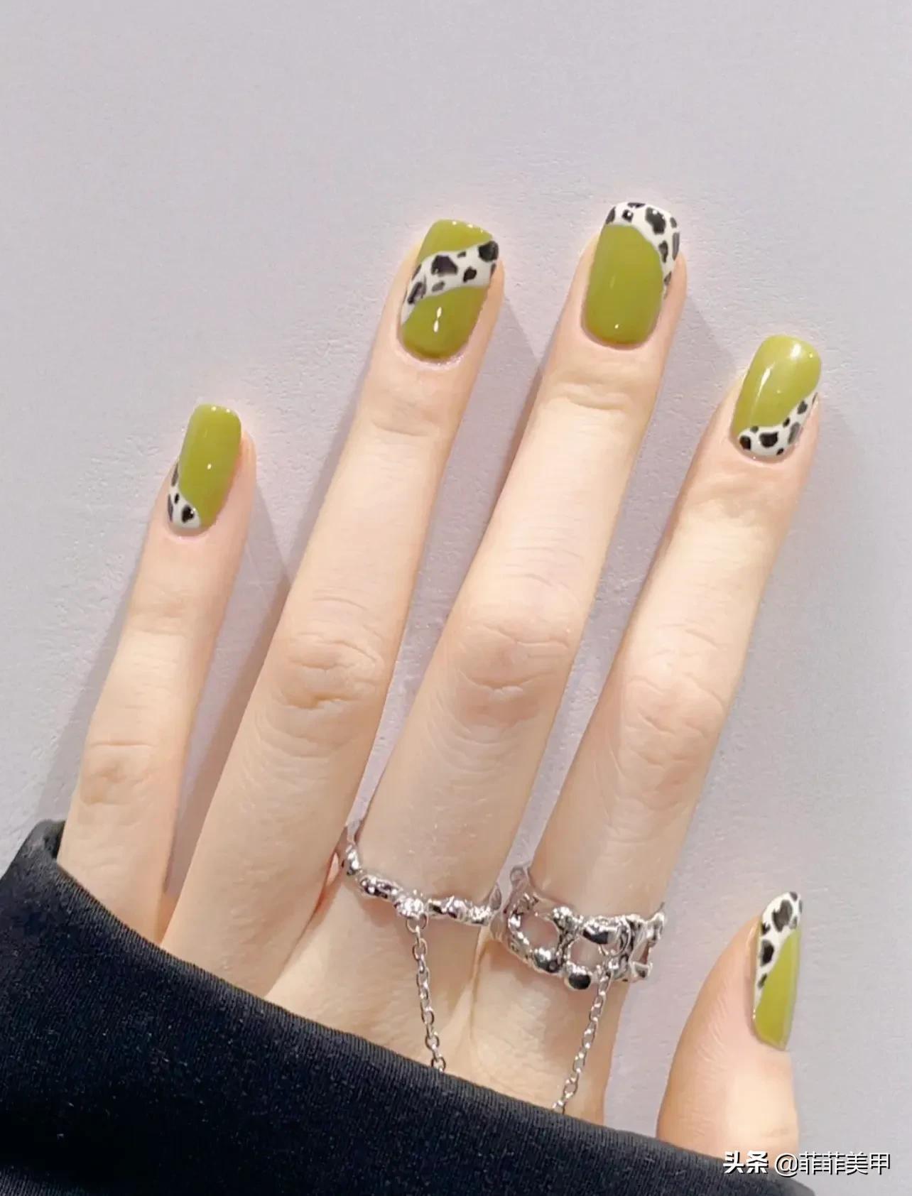 1,绿色系美甲 绿色显白小能手,夏天涂上清新淡雅,搭配黑色豹纹造型,清新又气质!有没有心动呀!