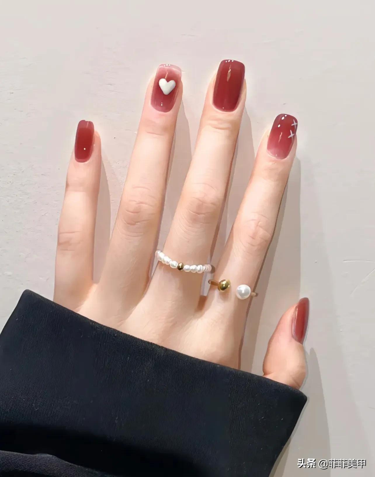 4,暗红色系美甲高级显白,整手同一色系!食指和无名指搭配简单白色绘画,耐看!