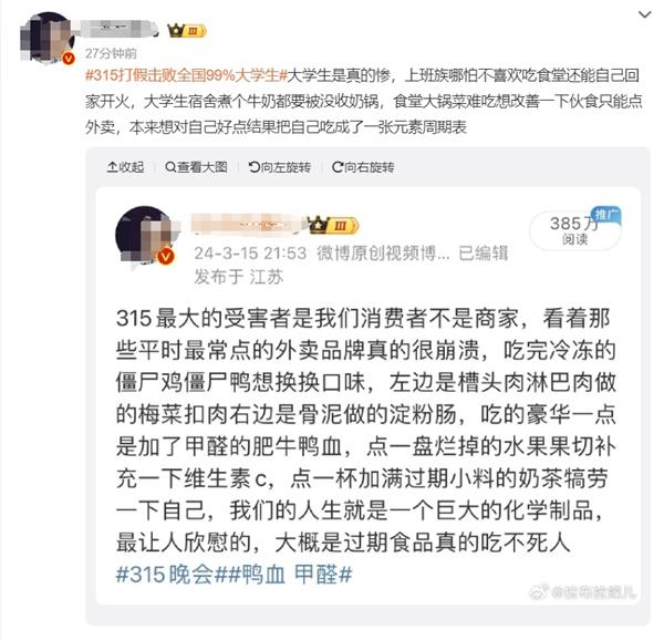 有博主发视频称,这次 315 打假最大的受害者不是商家,而是把我们大学生给打的面目全非,平常在学校就乐意吃点鸡公煲、吃点黄焖鸡,结果是冷冻僵尸鸡,我还能接受,毕竟价格摆在那儿了。