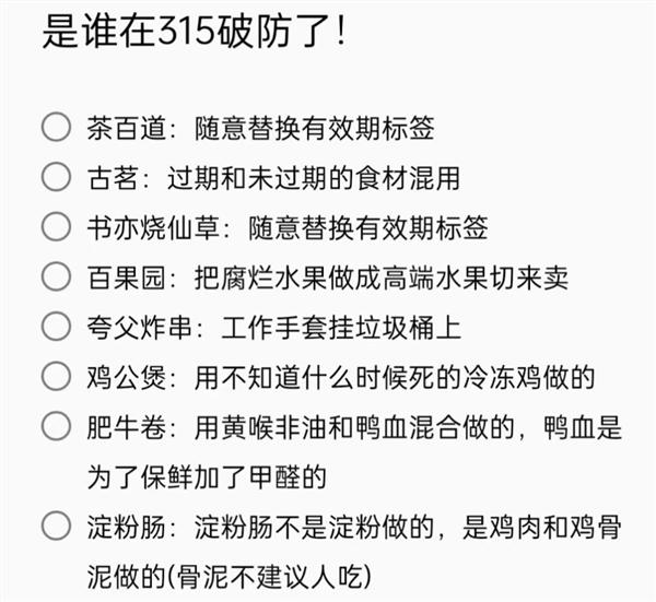 据国内媒体报道,今年 315 期间多家网红食品被曝光,包括夸父炸串、书亦烧仙草、古茗、茶百道、百果园等均被点名。