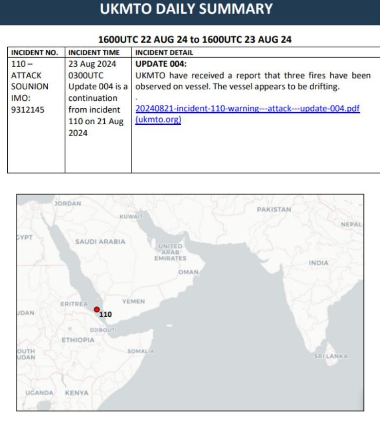 据悉," 苏尼翁 " 油轮上周三先是遭到小艇炮击导致失去发动机动力。随后欧盟军舰一天后赶到,将 25 名船员救起并送往吉布提。后续这艘油轮又遭到进一步的袭击,并持续燃烧至今。