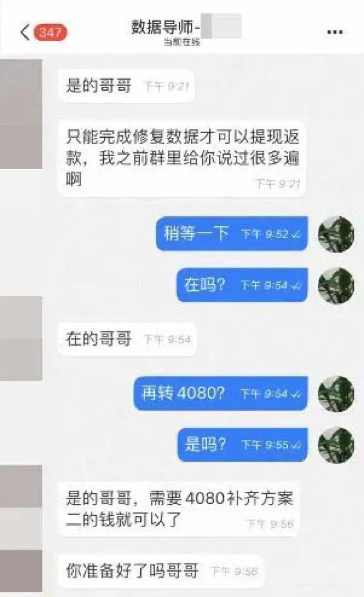 开始刘先生完成了两单充值 388 元的任务并获利 98 元。刘先生继续充值 2888 元后,客服告知其 " 订单超时 " 需重新下单。