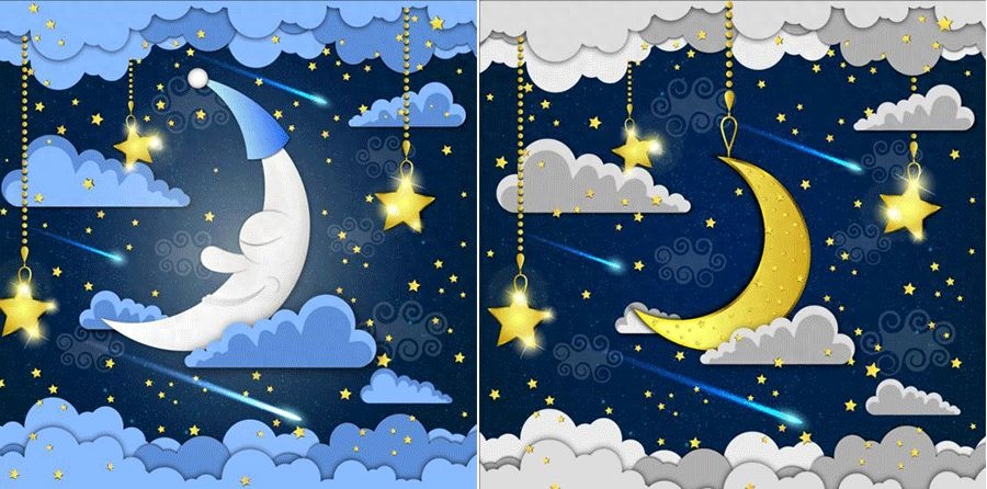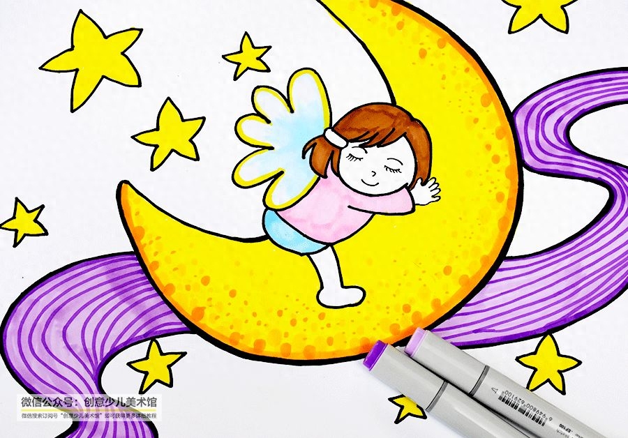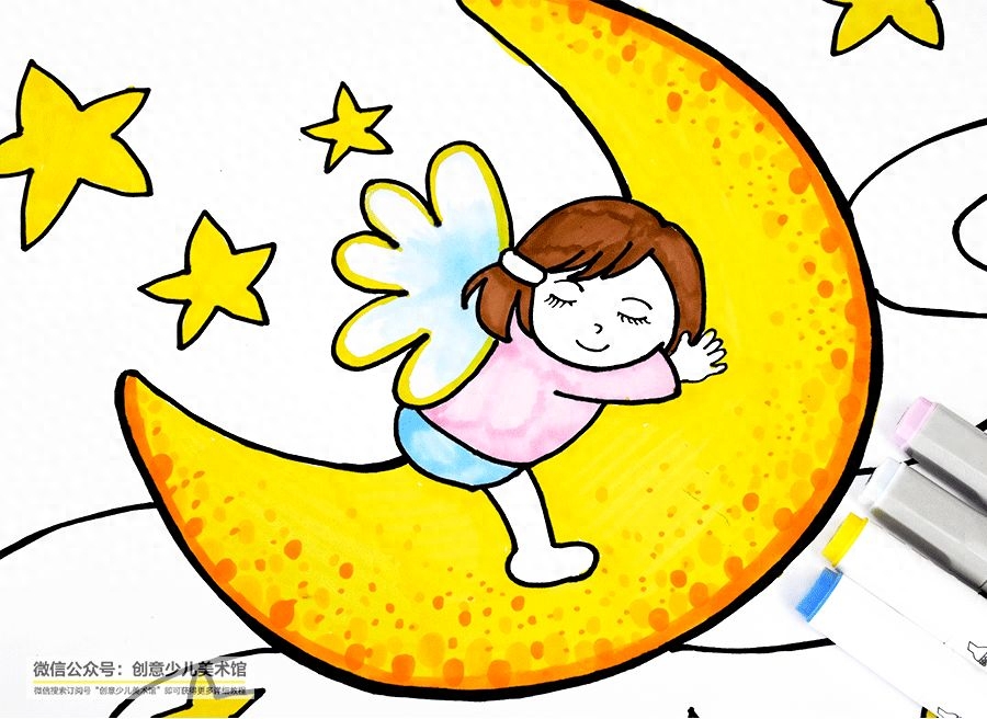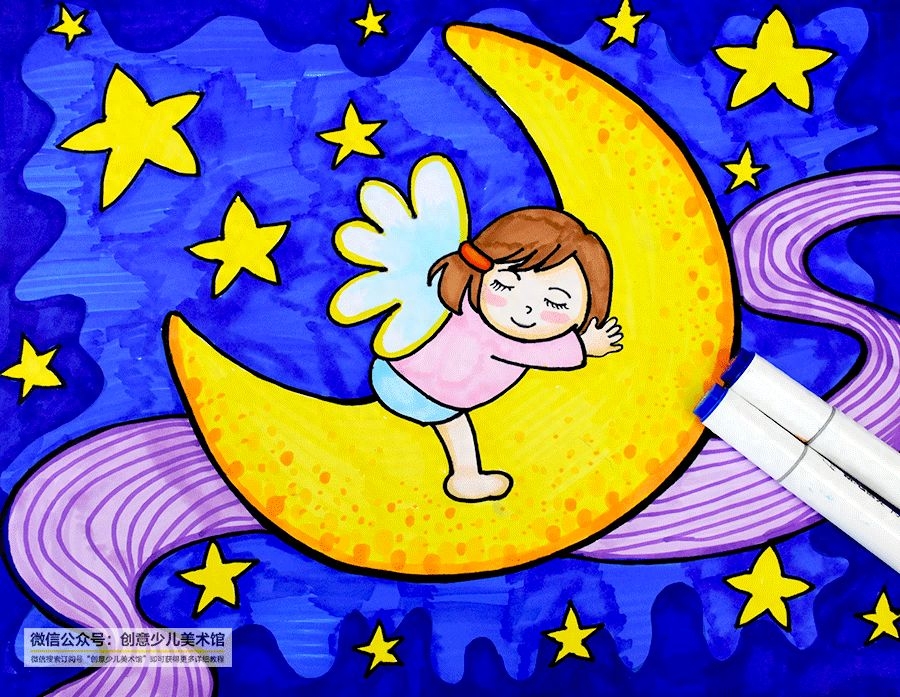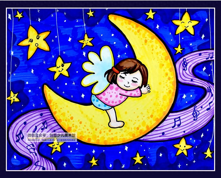 古往今来,月亮引发了人们无限的联想。你看,天空上挂着的一轮弯弯的月亮,多么像摇篮呀!在夜深人静的时候,人们甜甜地进入了梦想,月亮是否也睡着了呢?或者,在弯弯的“摇篮”里,装满了甜甜的梦?在今天的绘画课程中,我们通过深蓝色的夜空和亮黄色的月亮星辰,进行画面表现,体现出强烈鲜明的色彩美感,并通过以月亮为主体展开丰富的创想,扩展小朋友们的思维创作能力,体现出充满童趣的画面故事。我们一起来看看参考的教程吧!