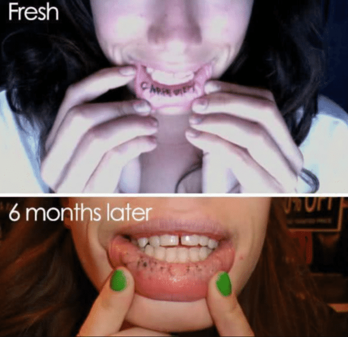 之前有段时间很流行唇纹,但是后来有权威证实这种唇纹是不利于口腔健康的,像这位小姐姐的唇纹,在嘴上已经留下了疮疤,可能终身都无法愈合吧