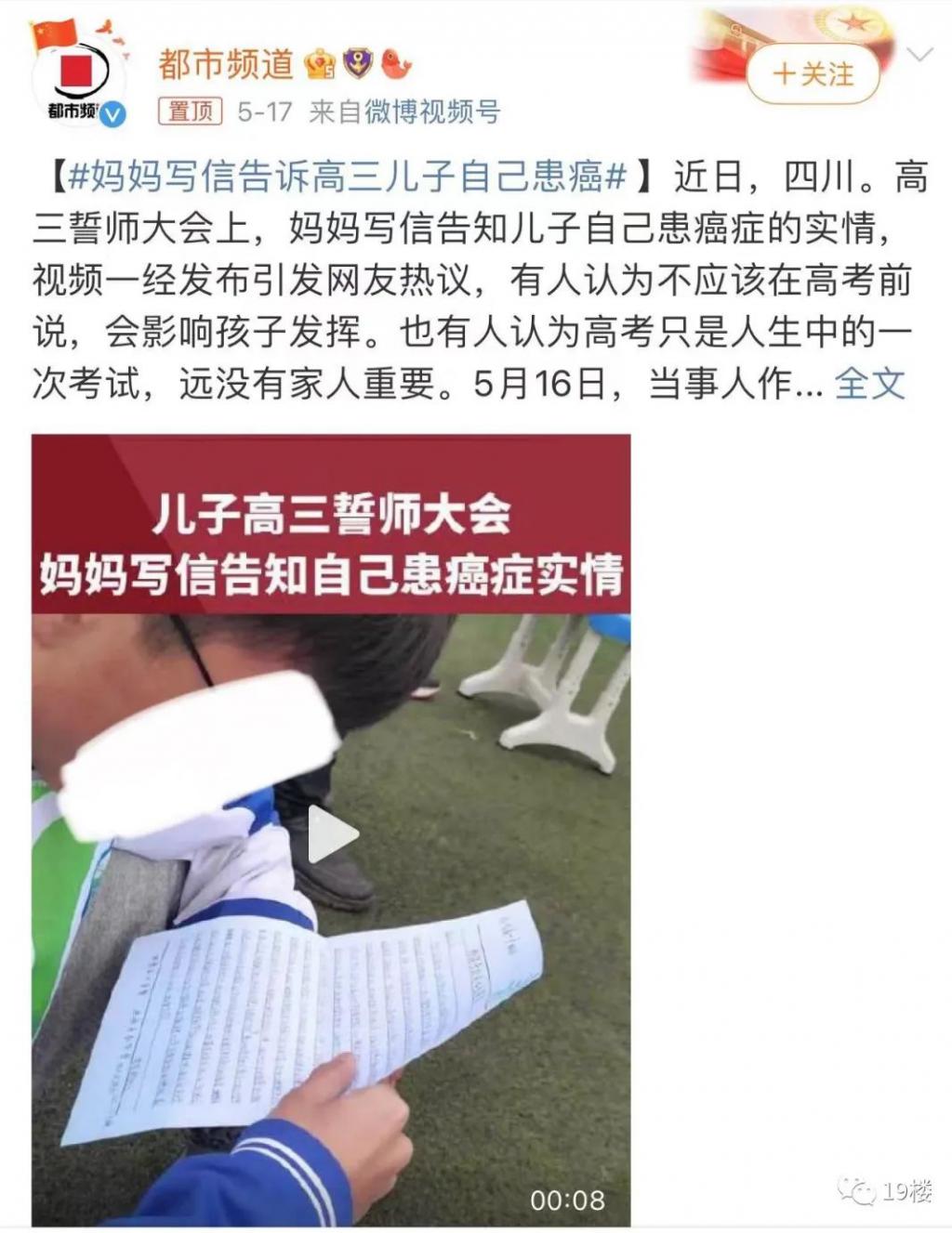 今年 4 月,四川的一场高三誓师大会上,妈妈写信告诉儿子自己患癌症的实情,视频发布后立即引发网友热议。