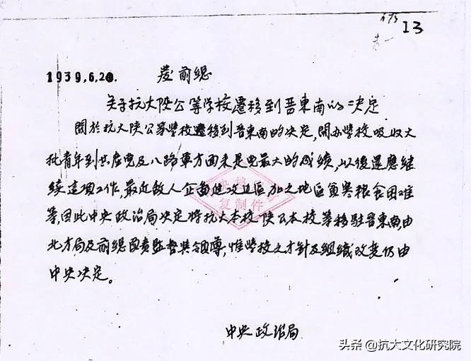 1939年6月20日,中共中央政治局作出《关于抗大陕公等学校迁移到晋东南的决定》。6月21日,罗瑞卿副校长在抗大召开的党的活动分子大会上传达了中央政治局这一决定,并详细阐明了这一决定的伟大意义。