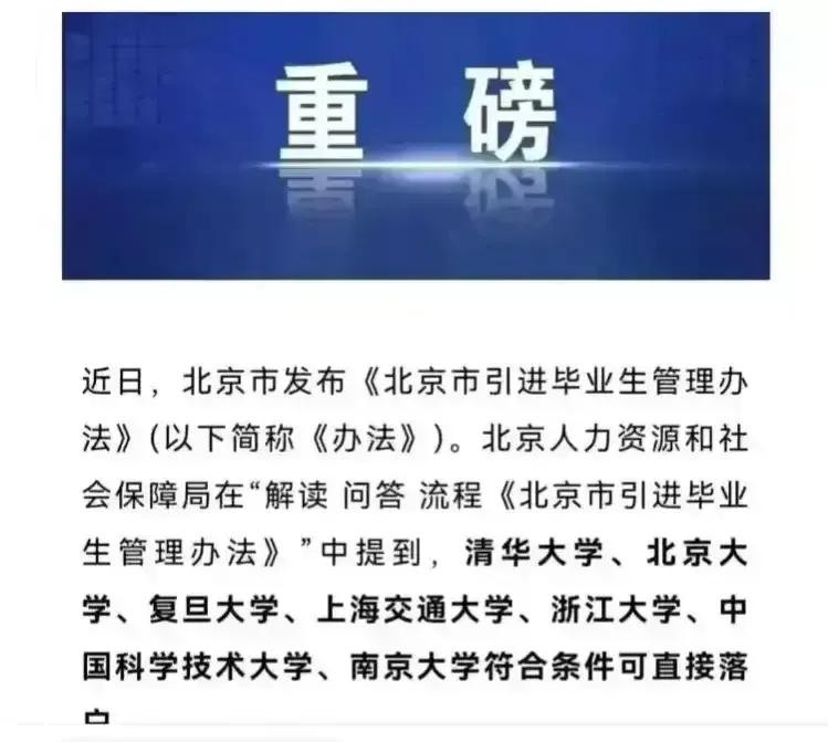 《北京市引进毕业生管理办法》中指出:清华大学、北京大学、复旦大学、上海交通大学、浙江大学、中国科学技术大学、南京大学可直接落户北京。