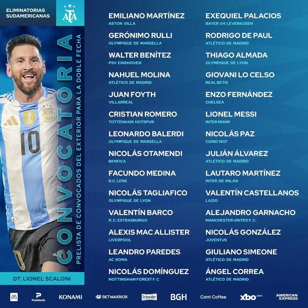 梅西、尼科-帕斯、胡利安-阿尔瓦雷斯、劳塔罗-马丁内斯、卡斯特利亚诺斯、加纳乔、尼古拉斯-冈萨雷斯、朱利亚诺-西蒙尼、安赫尔-科雷亚