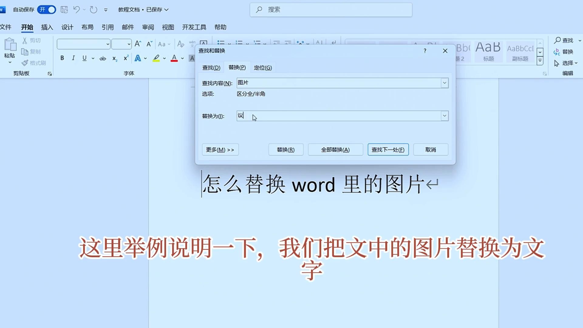 ·接着点下面的替换或是全部替换,这里举例说明一下,把文中的图片替换为文字,查找框输入图片,替换为框输入文字,然后点替换,是不是成功替换为文字两个字了。