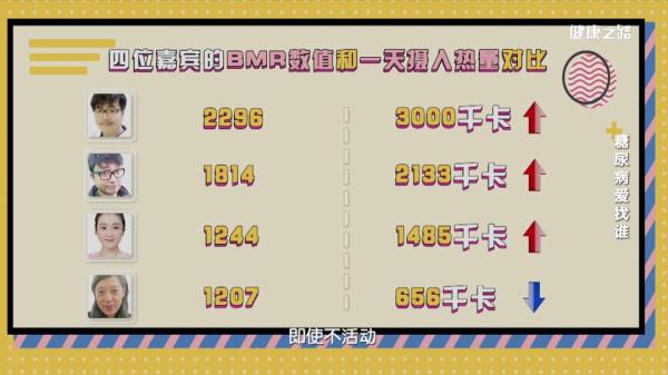 观察并记录一天的饮食情况,如果发现基础代谢率<一天摄入热量,说明测试者摄入热量没有被完全代谢,有可能造成体重增加。