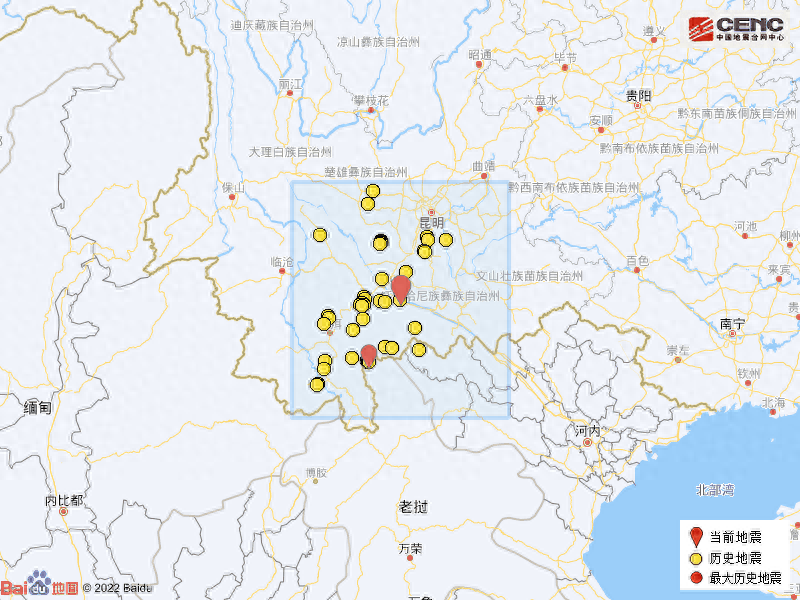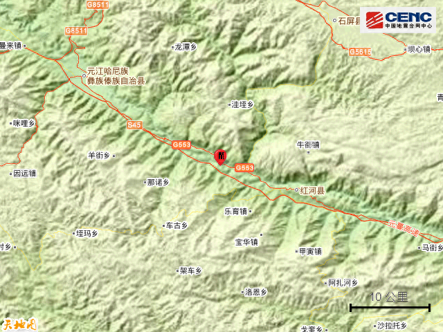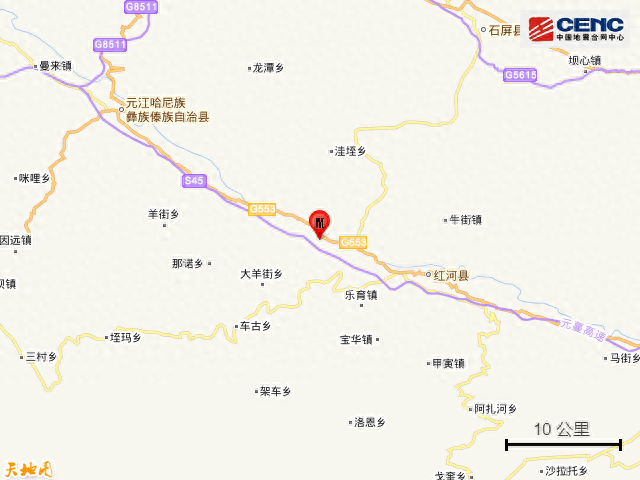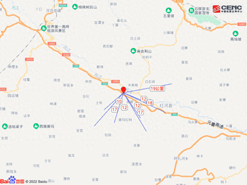 震中距红河县16公里、距元江哈尼族彝族傣族自治县34公里、距石屏县39公里、距绿春县49公里、距墨江哈尼族自治县59公里,距玉溪市108公里,距红河哈尼族彝族自治州113公里,距昆明市186公里。
