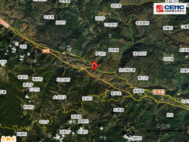 据中国地震台网正式测定,11月21日19时22分在云南红河州红河县发生3.6级地震,震源深度10千米,震中位于北纬23.42度,东经102.27度。