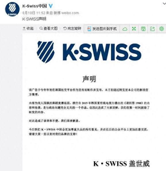 时隔一周,面对中国网友的巨大舆论压力,该广告的品牌方通过微博发表致歉声明,但否认该广告辱华,称广告内容为双人围棋的舞蹈竞赛场面,取自韩国电视剧《请回答1988》,与政治内容无关,并在第一时间删除了该内容。