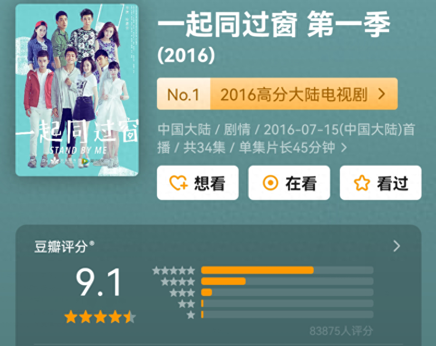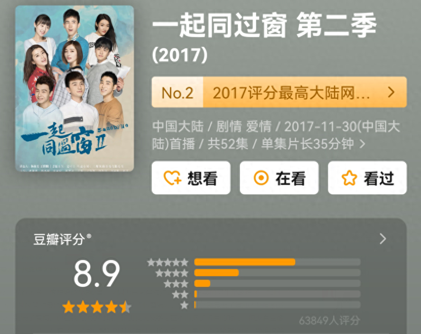 17年《一起同过窗》第二季播出,评分也有8.9,但这部网剧两季评分都这么高,在网上却没有什么水花,只有剧粉在自发安利,目前该剧第三季也在筹备中,但可能不是原班人马出演了。