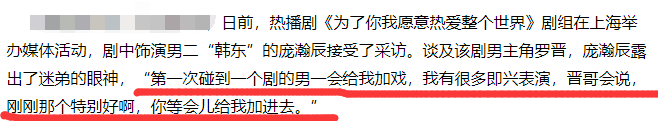 之后他又相继出演了《夏至未至》和《为了你我愿意热爱整个世界》 ,《夏至未至》的剧情实在是太狗血了,他演的段桥下线得太突然了,而在《为了你》中他演了男主的好兄弟韩东,庞瀚辰在采访时透露,罗晋是他碰到的第一个会给男二加戏的男主,他在剧组的时候经常会有一些即兴表演,罗晋觉得好的,就会给他加进去。