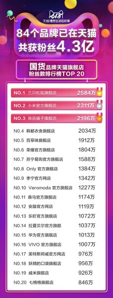 天猫618前,天猫公布了“天猫官方旗舰店粉丝数排行榜”,796个天猫官方旗舰店粉丝超过100万,84个品牌已在天猫共获粉丝4.3亿。其中,48%的粉丝大店都是国货品牌。