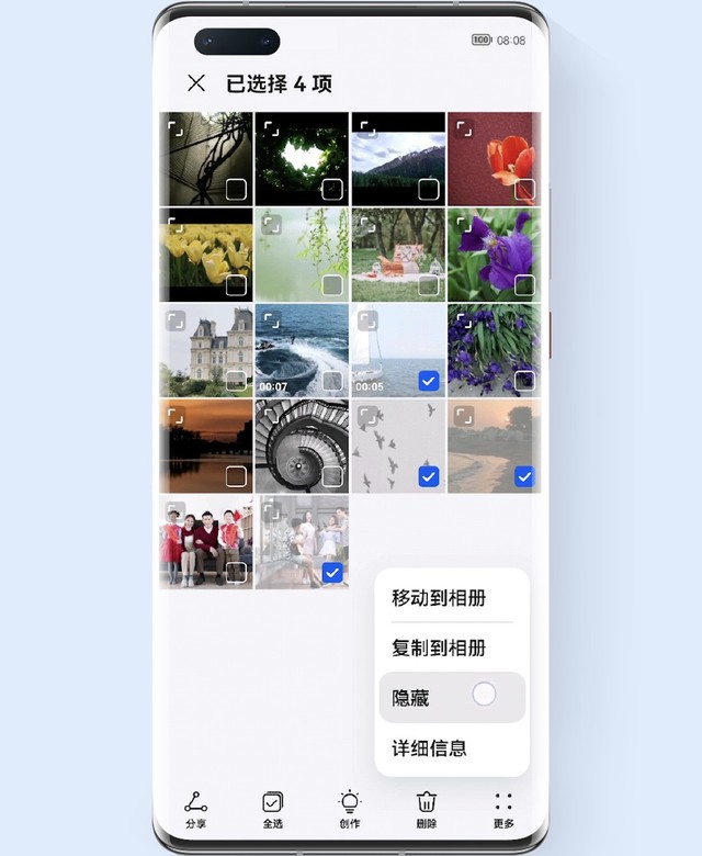 2、轻松隐藏相册,你的隐私你做主。在图库 APP,除了隐藏单个相册,你还可以选择一次隐藏单张或多张的图片 /视频,隐私保护,更稳妥。