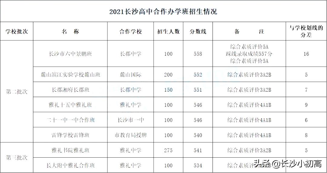 值得一提的是,合作办学班与学校本身的分数线相比,都高出了5-8分左右。其中,六中的景鹏班更是高出学校分数线16分之多(2021年长沙市六中的录取分数线为542分,六中景鹏班的录取分数线为558分)!