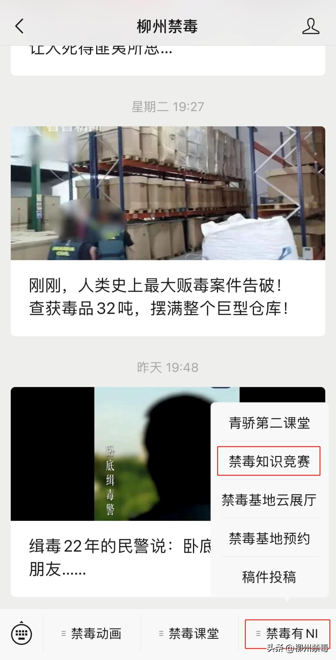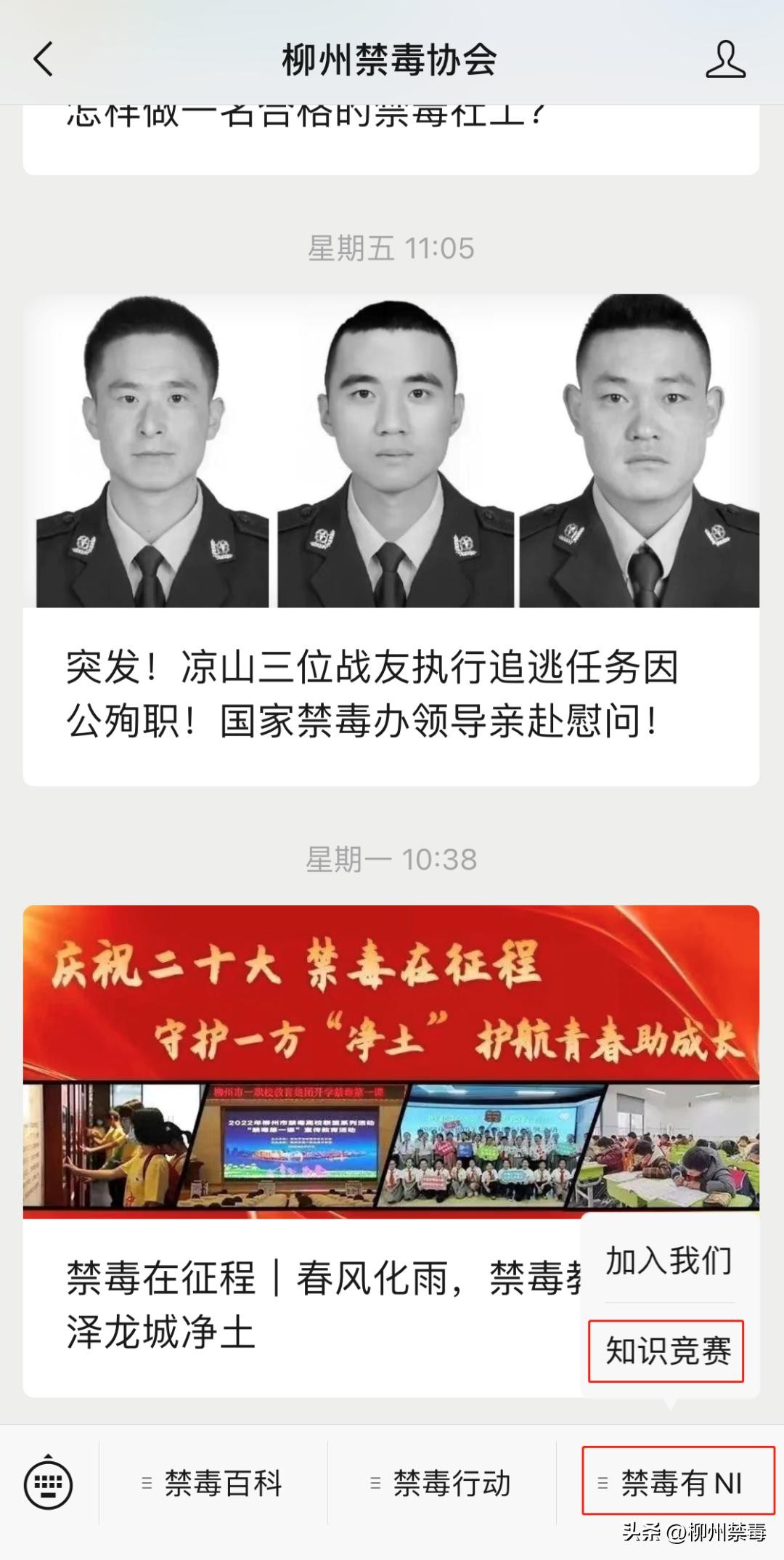 1.关注“柳州禁毒协会”或“柳州禁毒”微信公众号。