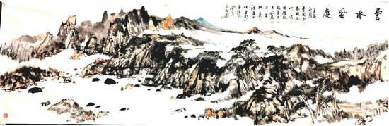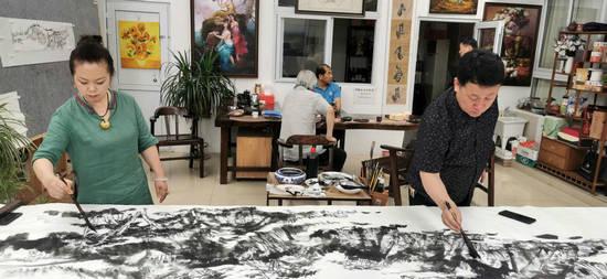 挂牌仪式上,艺术视界书画院李国良院长联袂北京宣和画院院长原国镭、清华大学美术学院美高胜雨导师、何啸、郑铁兵助教、画家张耀玫、汪军书、赵有臣,侯金明、王海鹰、孙雷、杜英共同创作了巨幅山水画——云水风度。