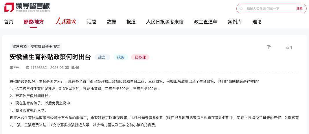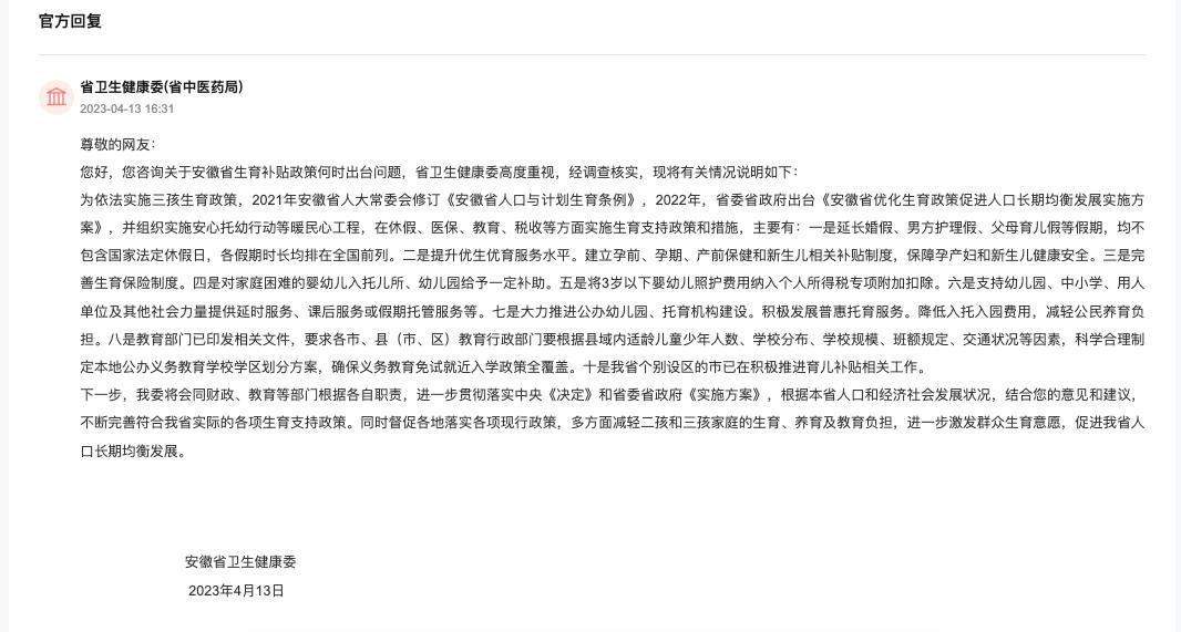 对于该网友所关心的“生育补贴政策”,安徽省卫生健康委在回复中表示,安徽省个别设区的市已在积极推进育儿补贴相关工作。