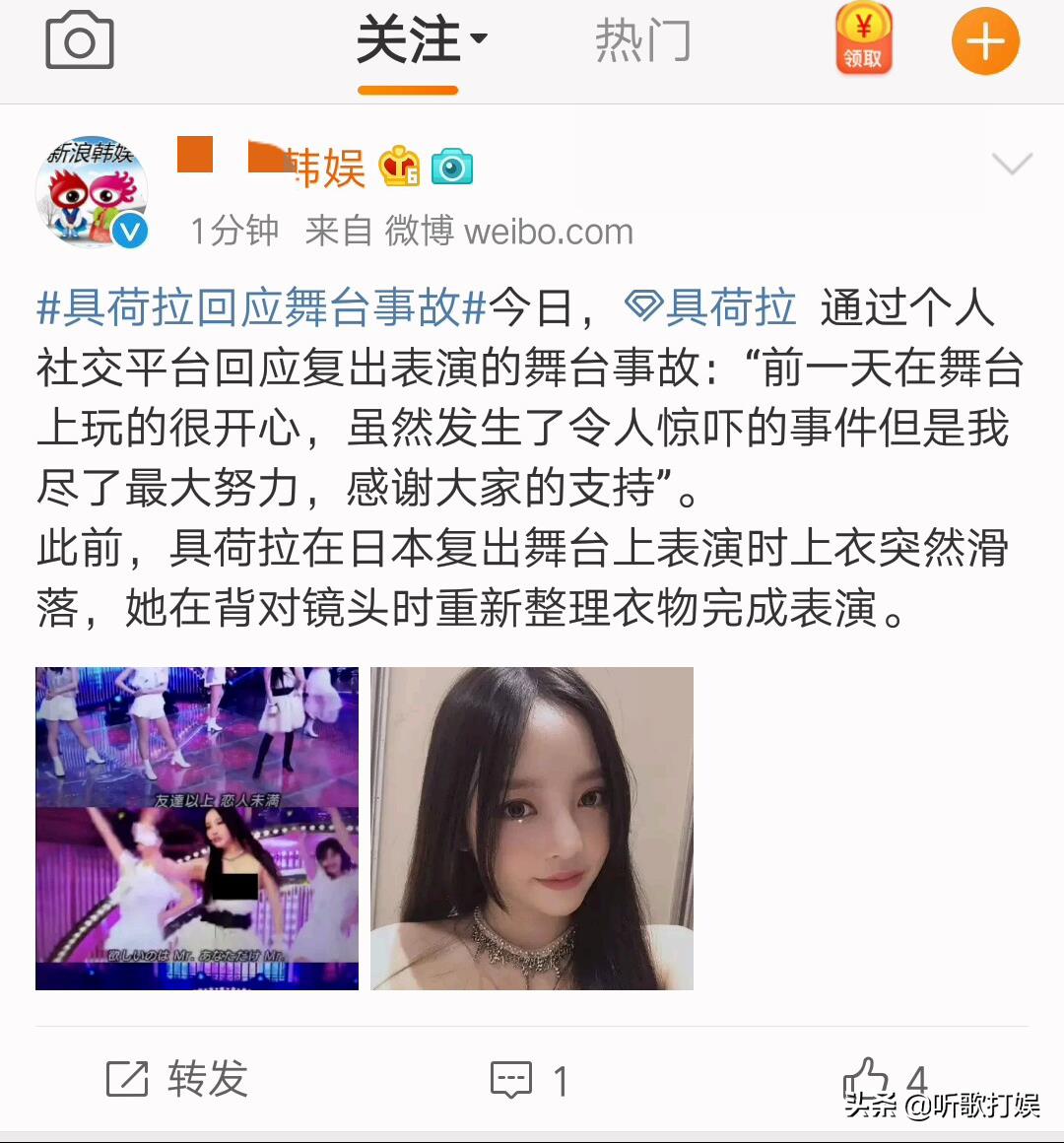 据悉,此前具荷拉在日本复出舞台表演时,抹胸连衣裙的上半部分突然滑落,画面立刻变得不可描述起来……想必最尴尬的要数欧尼本人了,但是具荷拉还是没有中场退出,在背对着镜头时重新整理衣物完成了表演,可以说是非常敬业了。