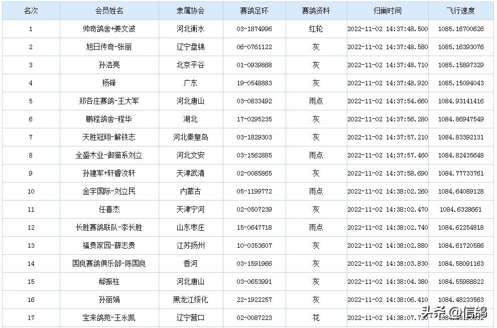 天津宇航小棚第三关比赛,在辽宁新民开笼放飞,实际空距513公里,共计上笼7538羽赛鸽,下午两点三十七分,第一羽赛鸽完成报到,冠军鸽是来自“帅奇鸽舍+姜文波”名下的一羽4996红轮赛鸽,分速1085.167米/分。“旭日传奇-张丽”名下的一羽1122灰鸽,几乎同时敲响鸽钟,获得第二名。截止到太阳落山前,共计仅归巢赛鸽639羽。