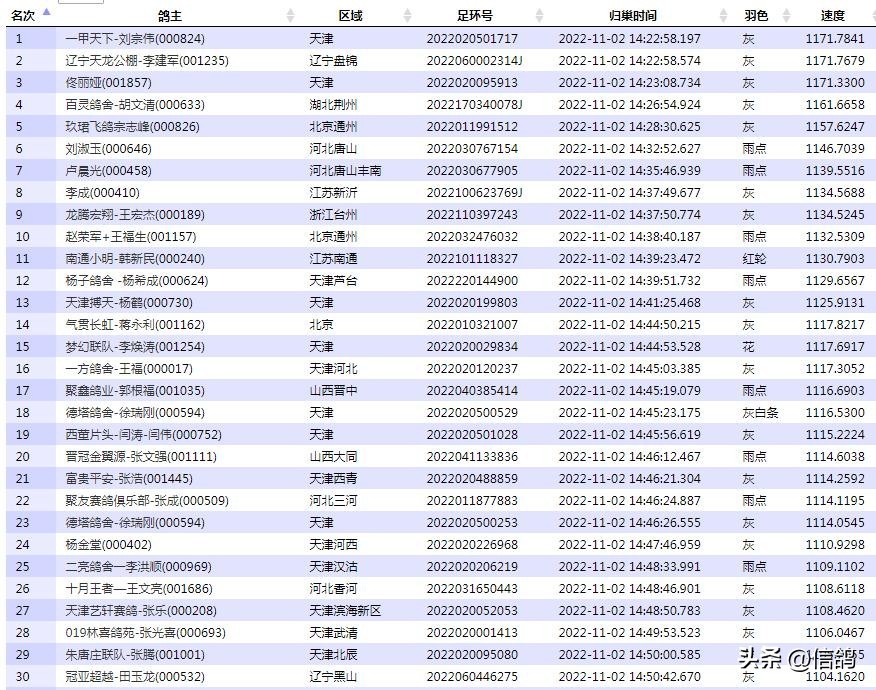 天津天野赛鸽公棚530公里决赛,在辽宁新民开笼放飞,共计11260羽赛鸽出征参赛,下午两点二十整,参赛鸽友刘广金名下的一羽0010雨点赛鸽率先落棚,将冠军奖杯收入囊中,分速1202.3米/分。鸽友王利川的一羽0002雨点赛鸽,紧随其后赶到,拿下本次比赛亚军。赛后统计,当天仅归来919羽赛鸽,当日归巢率8.16%。