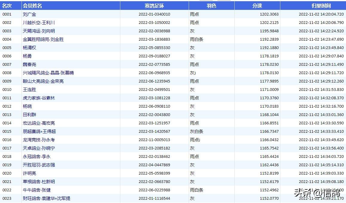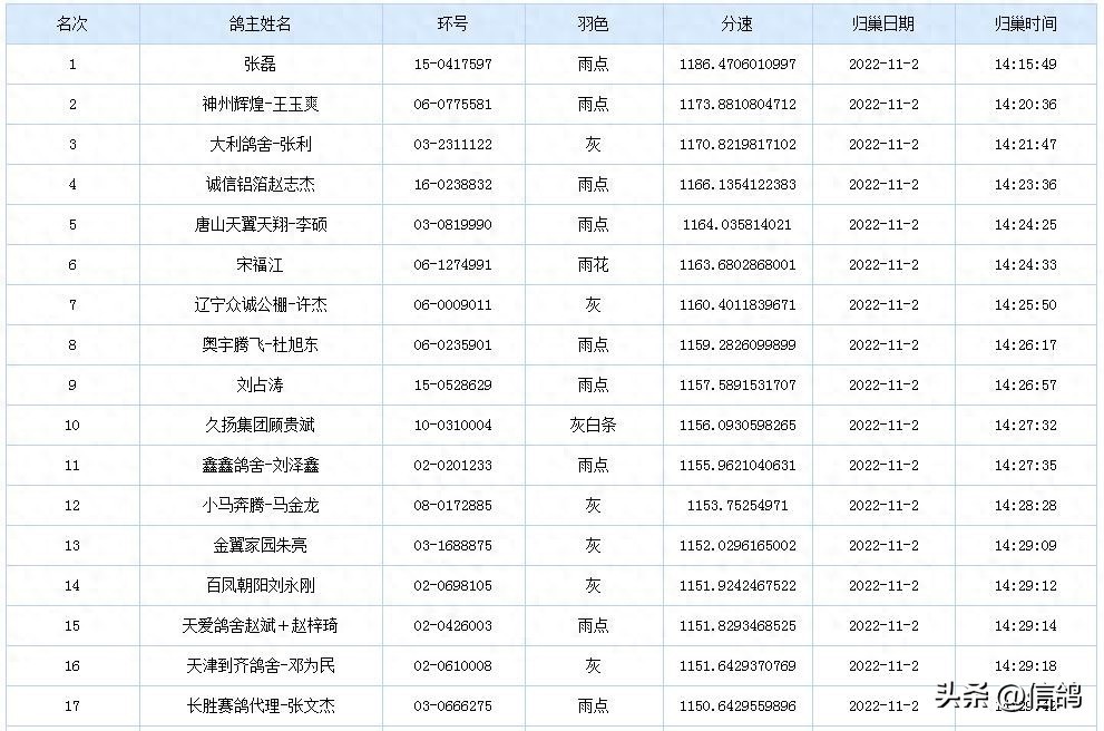 天津通翔公棚520公里决赛,在辽宁新民(公主屯)开笼放飞,共计7542羽赛鸽上笼参赛,下午两点四十二分,天津鸽友“一甲天下-刘宗伟”名下的一羽1717赛鸽,领先第一批梯队到达,获得本次决赛冠军,分速度1171.78米/分。“辽宁天龙公棚-李建军”名下的一羽2314号赛鸽,分速1171.76米/分,荣获决赛亚军。当天共计归巢391羽,当日归巢率5.1%。