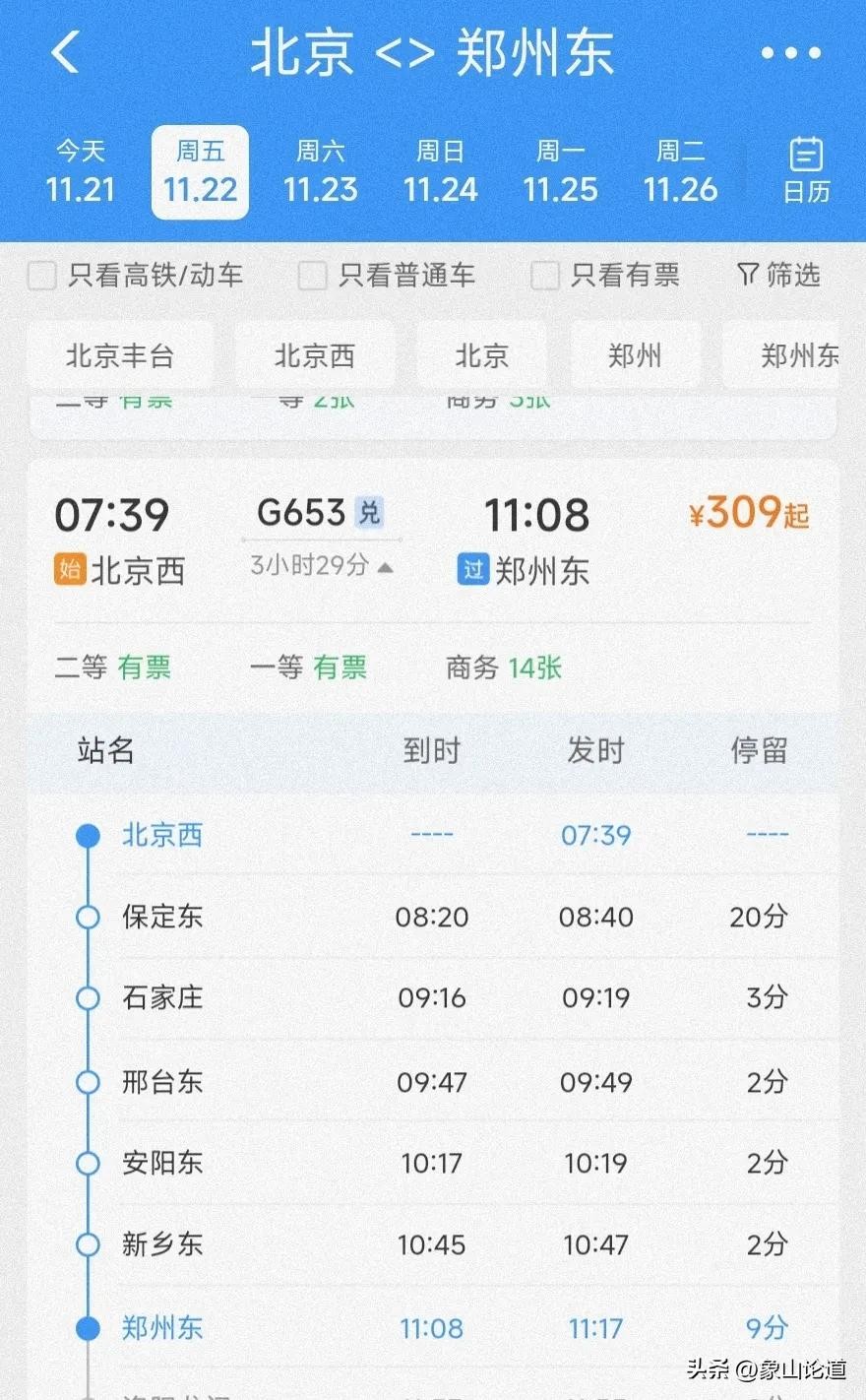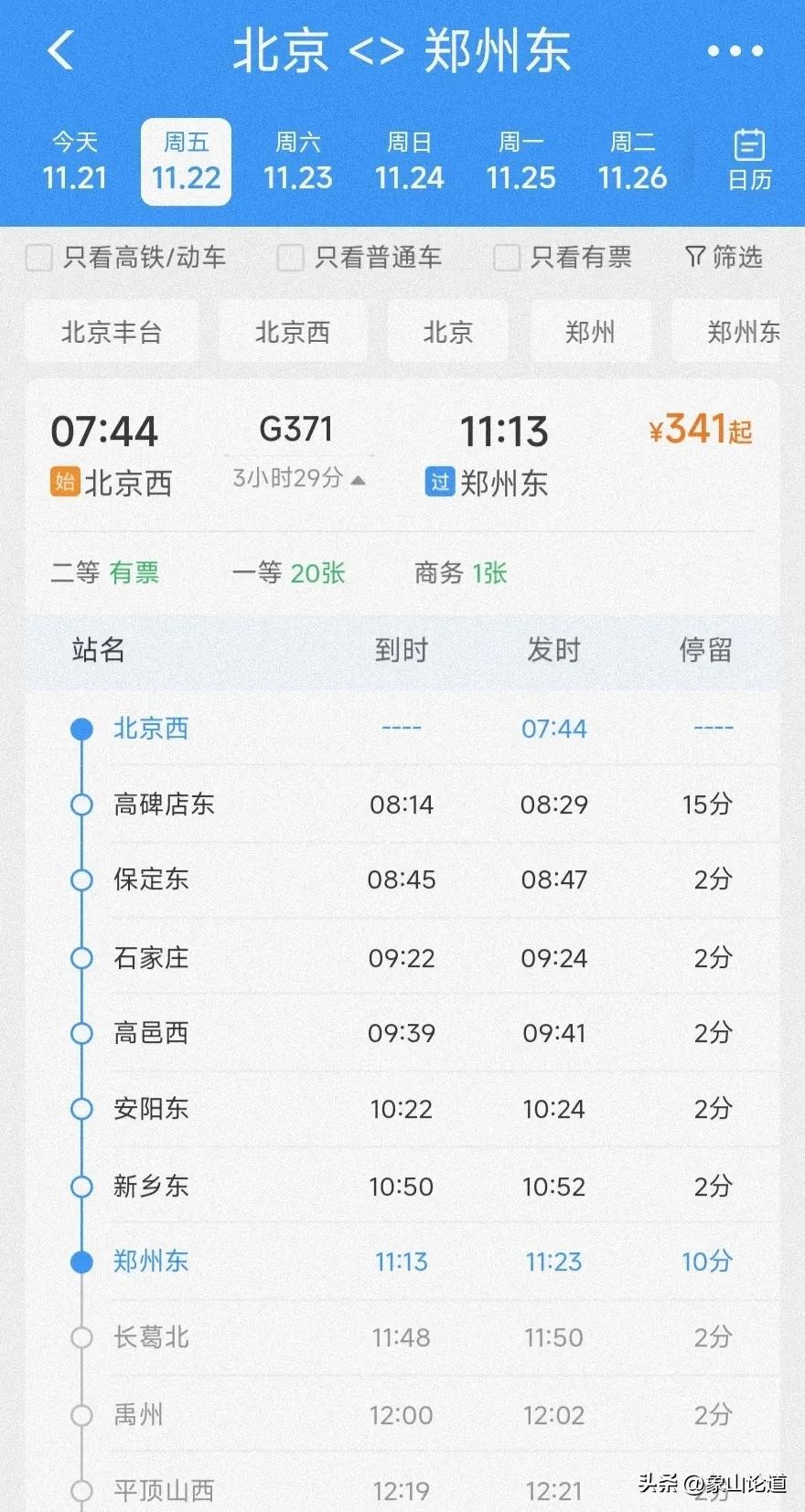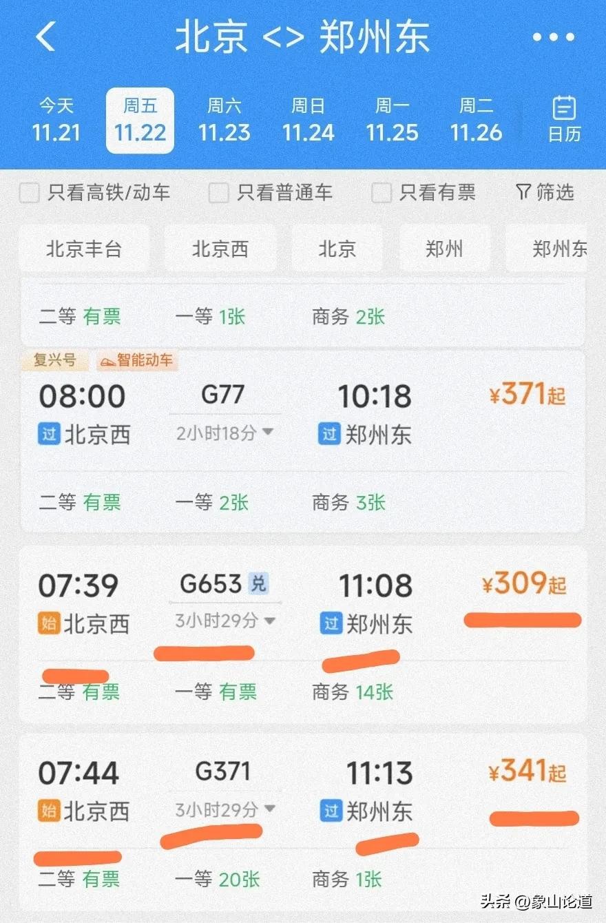最近乘坐北京到郑州东的高铁列车,发现不同时段,用时不同,票价也是不一样的。