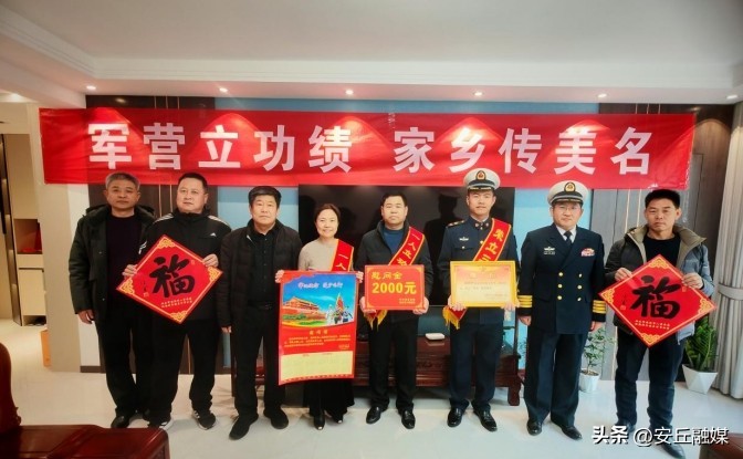 1月14日,由解放军某部队、安丘市人武部、市退役军人事务局及兴安街道联合组成送喜报慰问组,先后到赵永峰、闫铧中两位军人家中,为他们送去立功受奖喜报和慰问金的同时,也将荣耀与自豪带到他们家中。