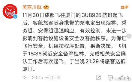 12月1日,网传四川航空成都飞厦门的航班疑发生意外,备降桂林后飞往厦门。川航一航班因旅客充电宝冒烟备降川航方面回应称事发当日成都飞往厦门的3U8925航班起飞后,客舱旅客随身携带的充电宝出现烟雾,为保证飞行安全,机组按程序处置,果断决策,飞机于18:38就近安全备降桂林,完成相关安全确认工作后再次起飞,于当晚21:29将旅客送抵厦门。(@美丽川航 )