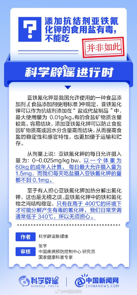 亚铁氰化钾是我国允许使用的一种食品添加剂。《食品添加剂使用标准》中规定,亚铁氰化钾可以作为抗结剂添加在“盐或代盐制品”中,最大使用量为0.01g/kg。从剂量上说,亚铁氰化钾的每日允许摄入量为:0~0.025mg/kg bw,以一个体重为60kg的成年人计算,每日最大允许摄入量为1.5mg,而我们每天吃盐摄入亚铁氰化钾的量都不到0.1mg。(来源:@科学辟谣 @中国新闻网 )