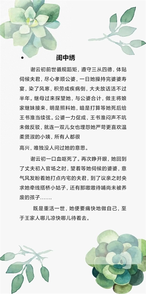 本文作者希昀,女主重生而来,前世的女主尽心尽力的照顾公婆,关爱夫君。谁知染了风寒,竟然一病不起,大夫断言活不过一年了。继母和继母肖想她的主母之位,公婆也十分赞成,至于他的夫君也无半声反对之声,儿女也因为她的管教严格背离了自己。前世的她与其说是病死的,不如说是气死的。重生归来,这一次她要为自己活。(实际上上一世有误会,男主只是话少,并不是不爱女主,虽然前世让女主受了委屈,但是最后替她报了仇)