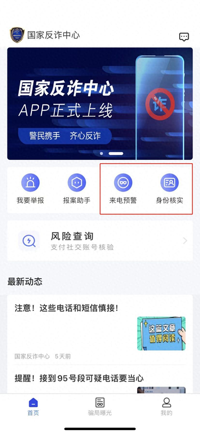 首先,当然是下载国家反诈中心app啦 。app首页有 [ 来电预警功能 ],能够有效地识别并拦截诈骗电话,降低被诈骗的风险,若app未能拦截成功,则可以在首页的 [ 身份核实 ] 功能中,将可疑电话进行核实,若有风险,则会有弹窗提示。