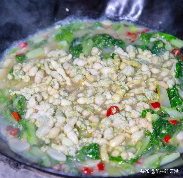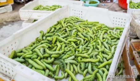 在连云港灌云就有这么一种食材—豆丹,豆丹是豆天蛾的幼年体,形状像蚕,但颜色不一样,豆丹呈现绿色。