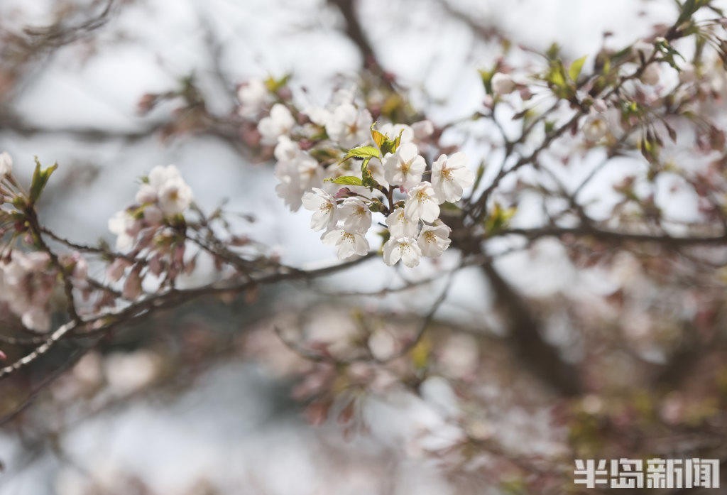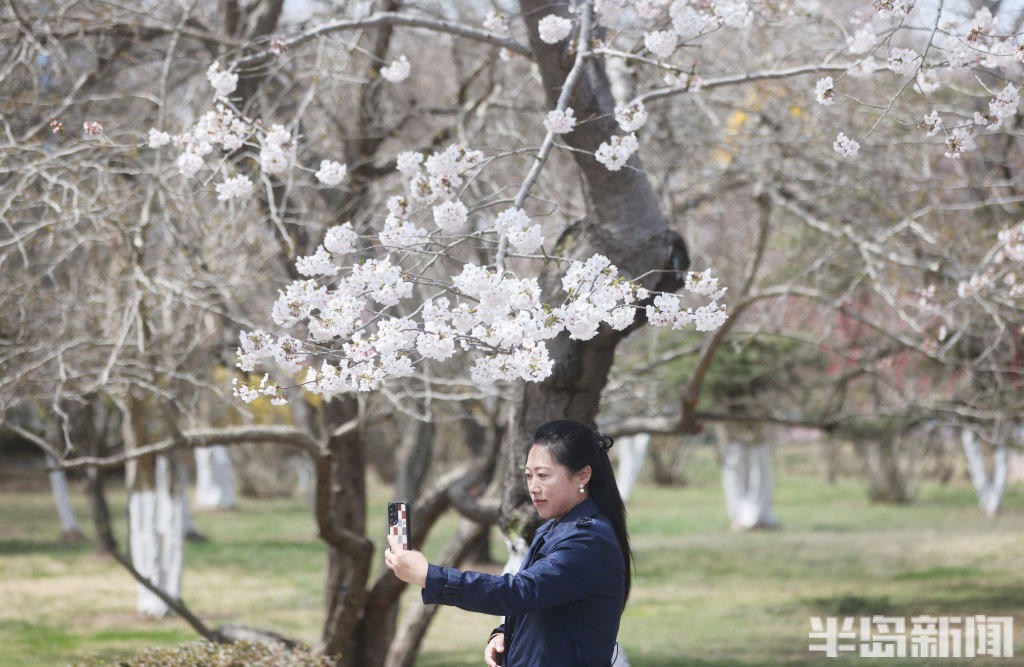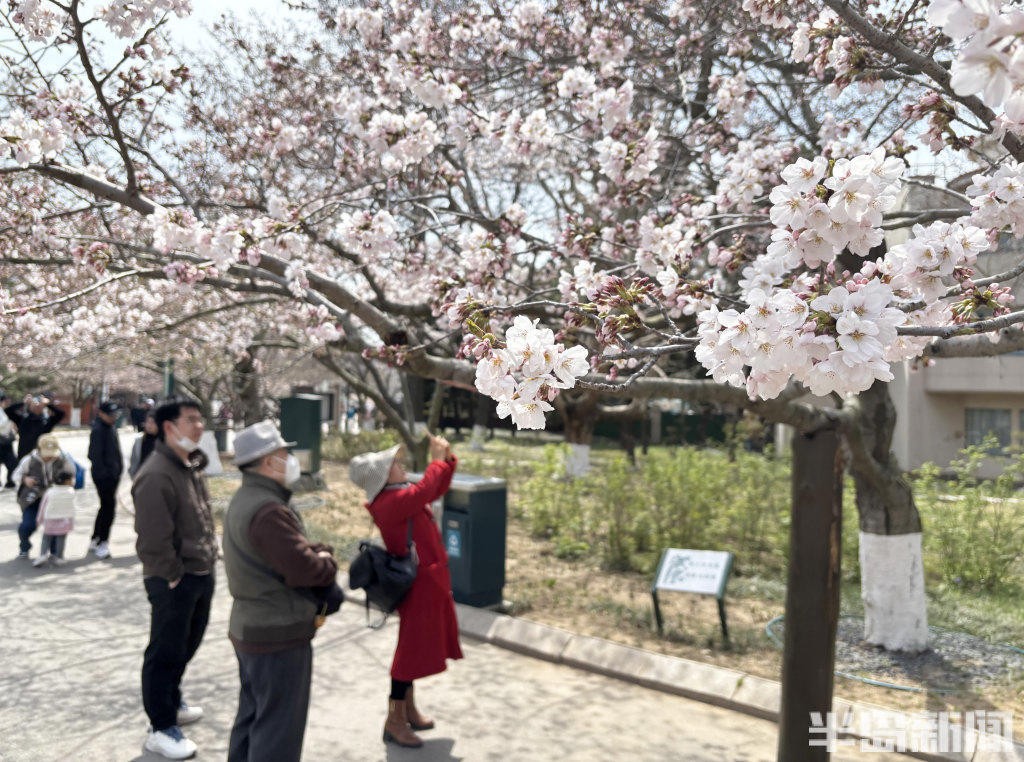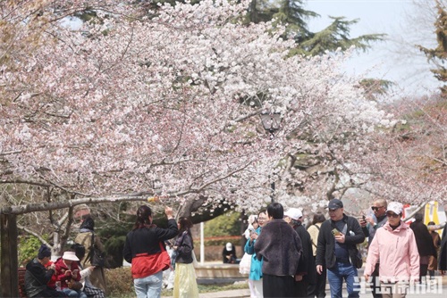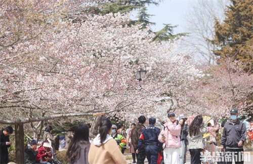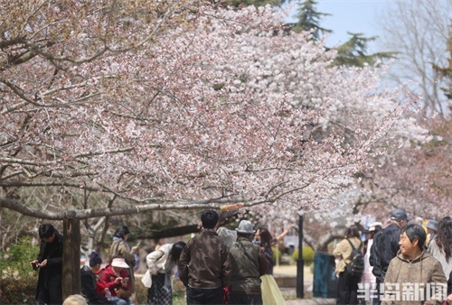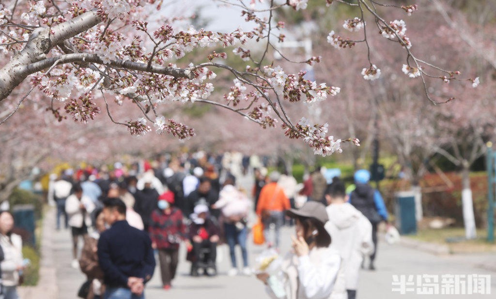 4月3日,青岛中山公园内前来赏樱花的游人络绎不绝,樱花大道上熙熙攘攘的非常热闹,几乎每棵樱花树下都有游客在拍照。