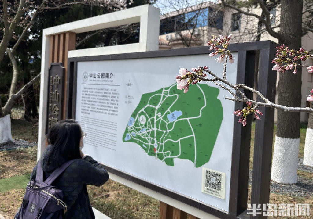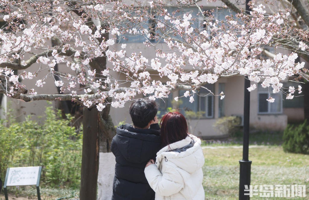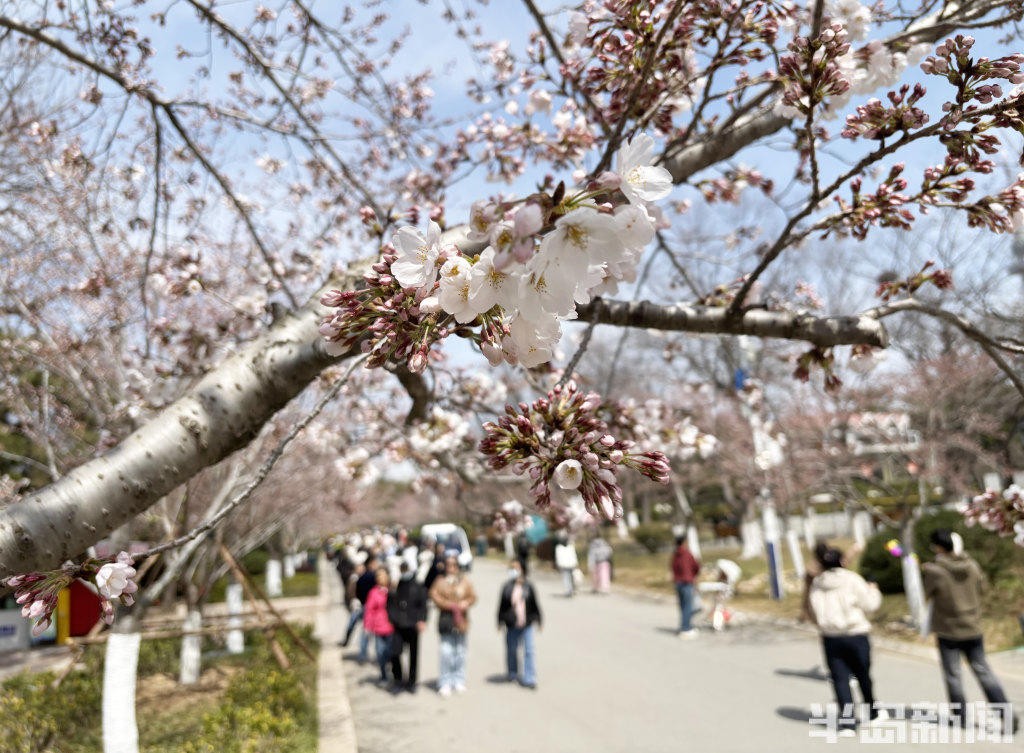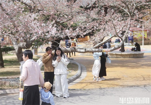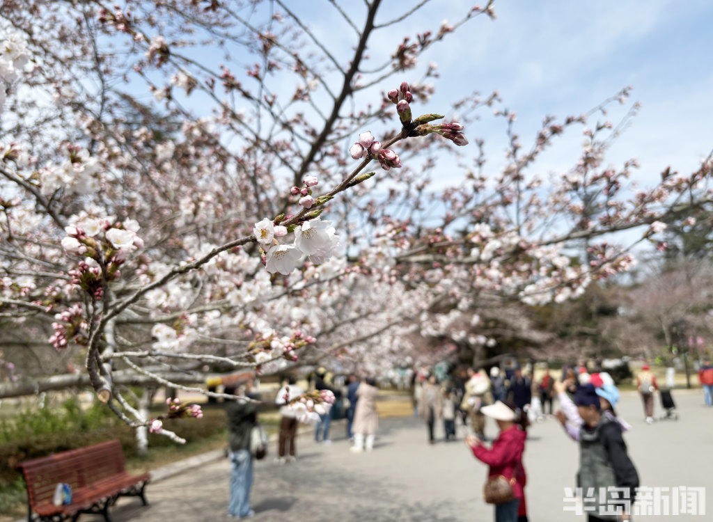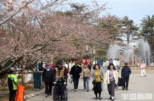 4月3日,青岛中山公园内前来赏樱花的游人络绎不绝,樱花大道上熙熙攘攘的非常热闹,几乎每棵樱花树下都有游客在拍照。