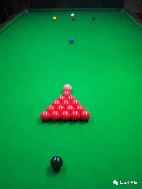 面向红球,半圆三个点从左至右依次是绿球,咖啡球,黄球,中袋位置摆蓝球,再往上是粉球,然后是红球堆,最后一个是黑球。彩色球都有点位