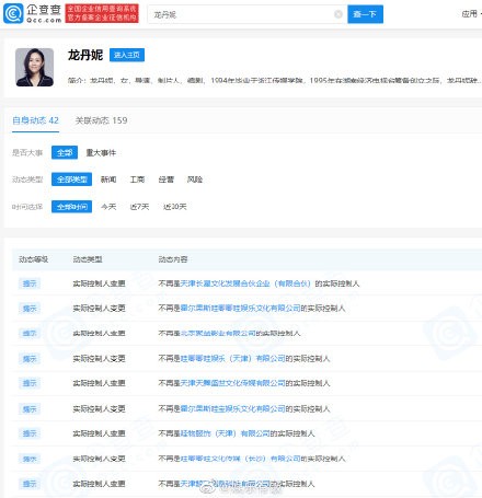 据企查查,3月28日,龙丹妮不再担任9家公司实际控制人,其中包含哇唧唧哇主公司、天津分公司、服饰公司等。涉及公司实际控制人从“龙丹妮”变更为“彭力、天津高星文化发展有限责任公司”。