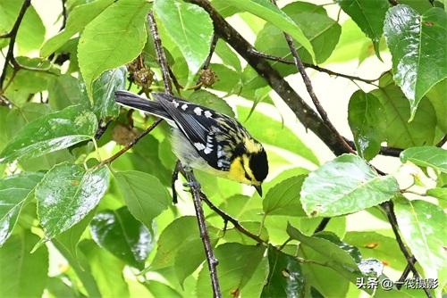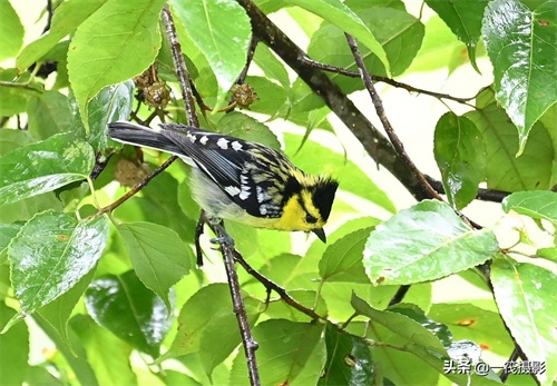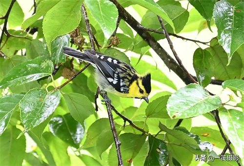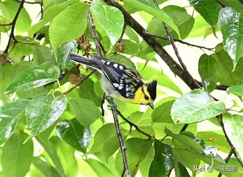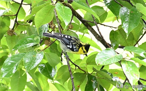 黄颊山雀。前额、眼先、头侧和枕鲜黄色,头顶和羽冠黑色,眼后有一黑纹,上背黄绿色。