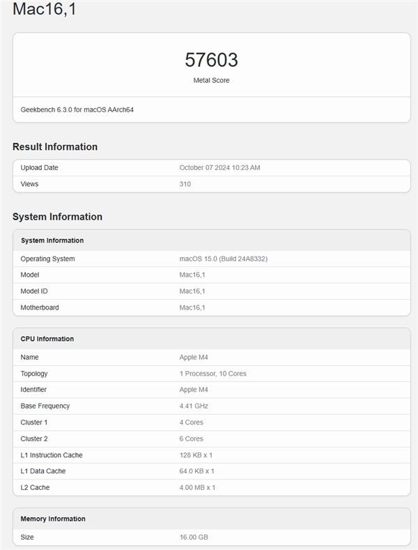 苹果计划在11月初推出M4 Mac,Geekbench跑分成绩为单核分数3864分,多核分数15288分,这一成绩是在名为“Mac16,1”的测试机型上获得的,该机型搭载了10核CPU。