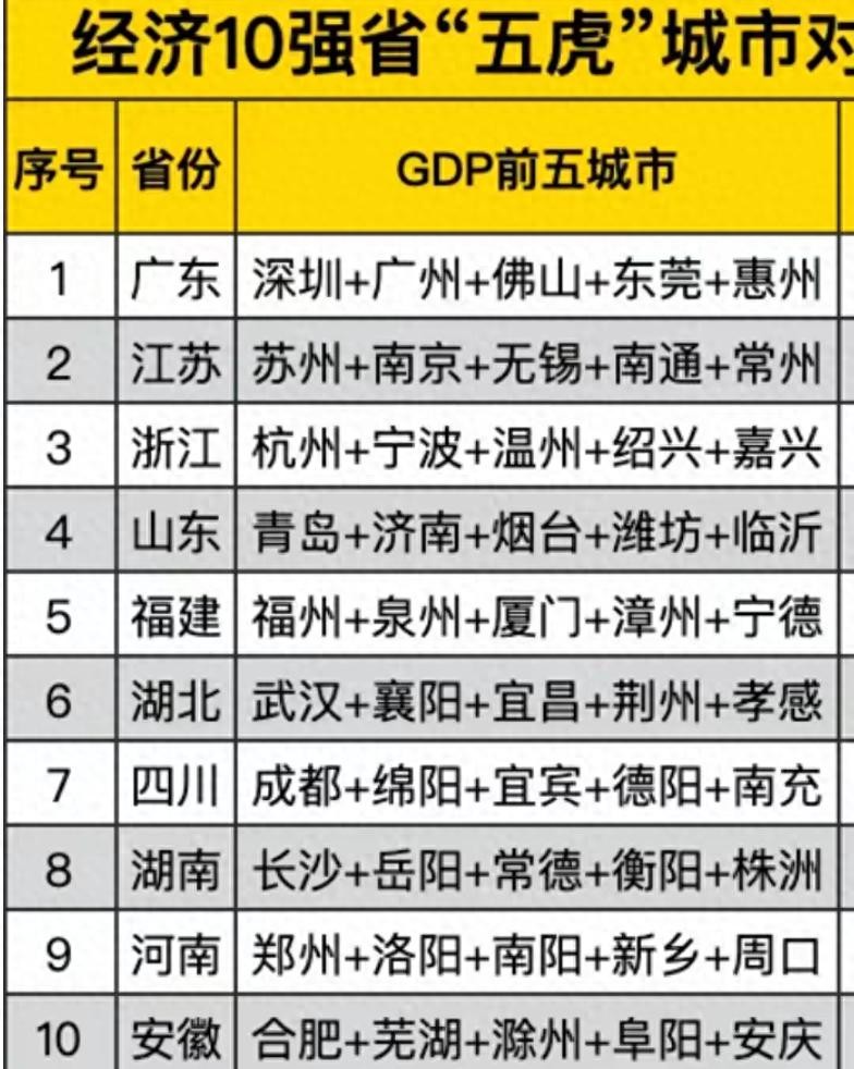 那么,作为中国大陆GDP十强省份,其“五虎”城市GDP之和排名如何呢?以下数据采自2024年。
