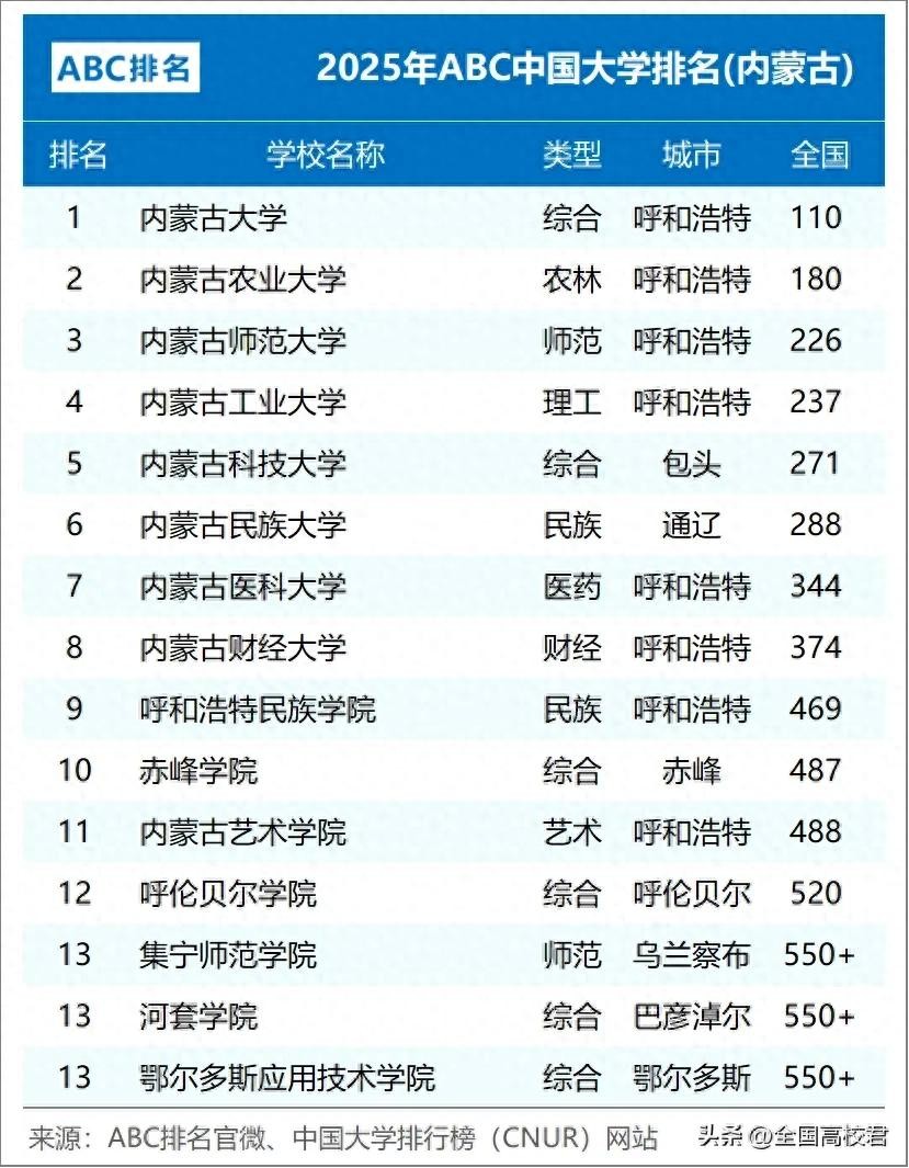 2025年内蒙古自治区大学排名:内蒙古大学领衔,多所高校表现亮眼