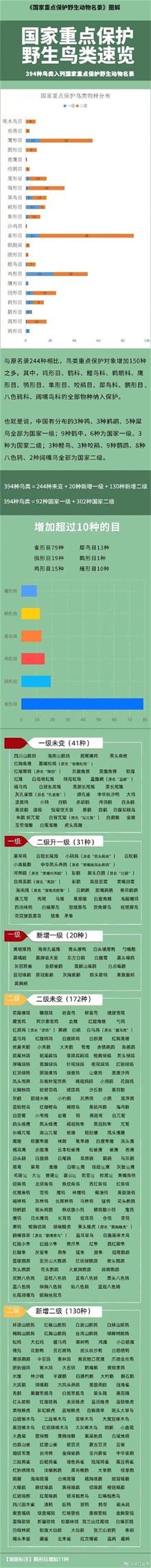【涨姿势!394种国家重点保护野生鸟类一图了解】民生视角近日,国家林业和草原局、农业农村部联合发布新调整的《国家重点保护野生动物名录》,名录中394种鸟类变化情况戳图了解via中国林业网