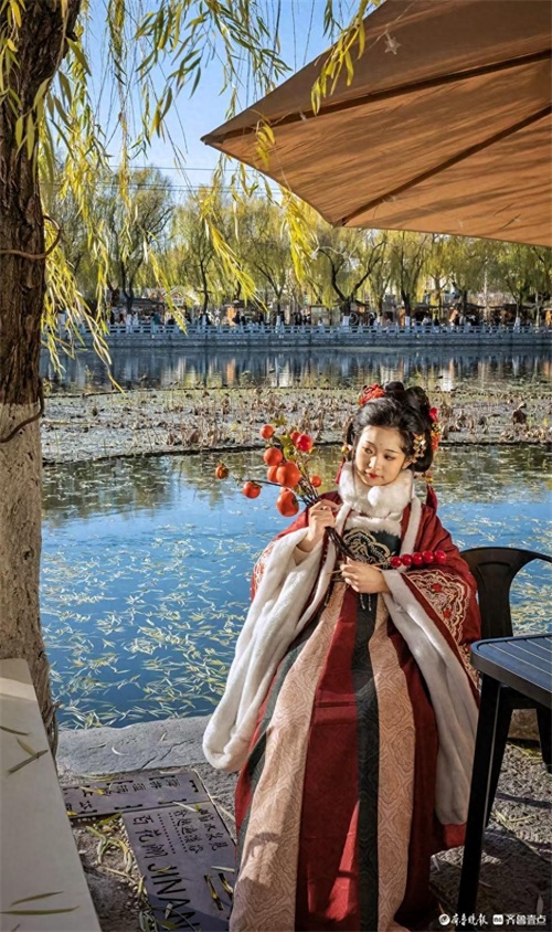 12月31日,在济南百花洲,年末岁尾,风和日丽,年轻人手拿吉祥寓意的苹果柿子,在百花洲打卡留念。