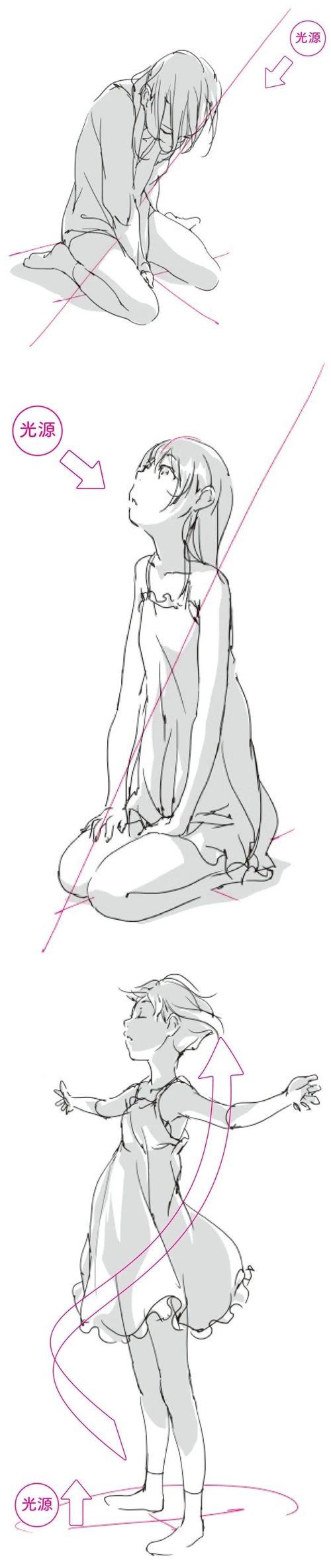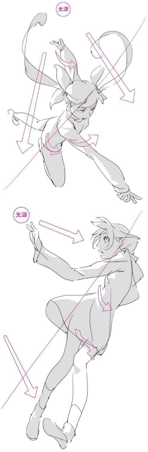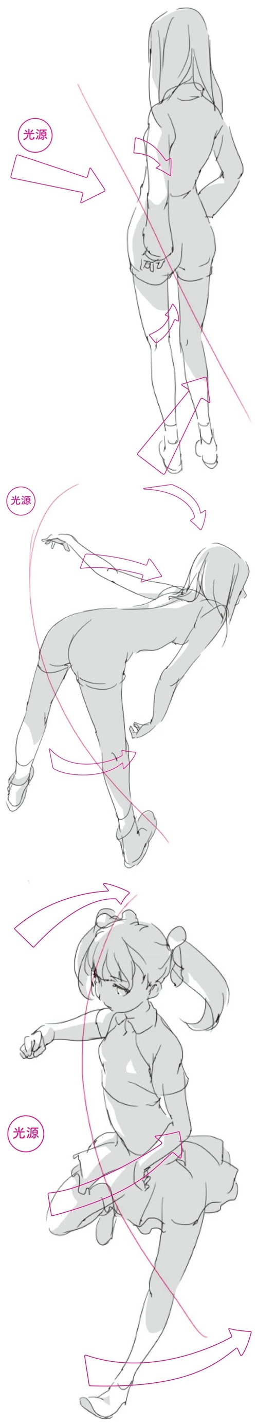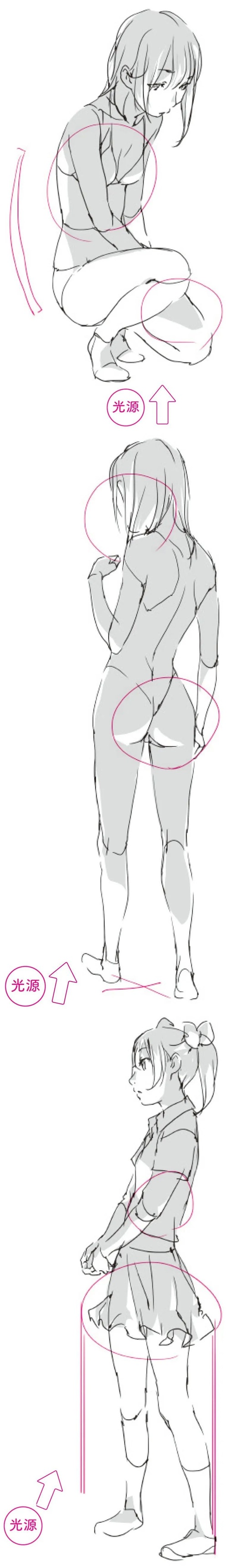 「绘画参考」女性人体动态姿势的立体感和阴影的绘制(人体参考)