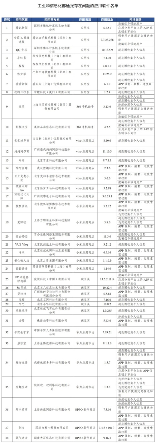 今年以来,我部持续加大对APP侵害用户权益的整治力度,先后三次组织对重点问题开展“回头看”。前期,重拳整治了APP违规调用通信录、位置信息以及弹窗信息骚扰用户等问题。近期,针对用户反映强烈的APP超范围、高频次索取权限,非服务场景所必需收集用户个人信息,欺骗误导用户下载等违规行为进行了检查,共发现38款APP(详见附件)存在问题。上述APP应在11月9日前完成整改,逾期不整改或整改不到位的,我部将依法依规进行处置并予以行政处罚。