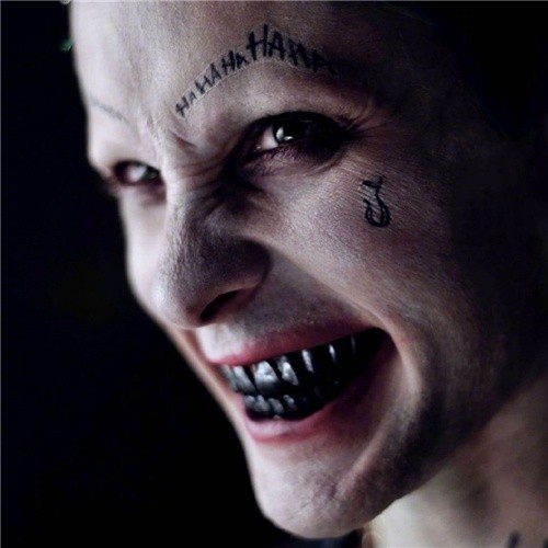 该照片应是角色定妆之前的造型测试,莱托一口涂得漆黑的牙齿十分显眼,相较漫画也有较大改变。另一处亮点则是“眉毛”,眉贴上采用了小丑标志性的笑声“HAHAHAHA”。这一版妆容颇为大胆前卫,可惜的是并未在正片中得到完整保留。《自杀小队》中的小丑没有眉毛也未用眉贴,牙齿换成了乱糟糟的银色合金镶牙。