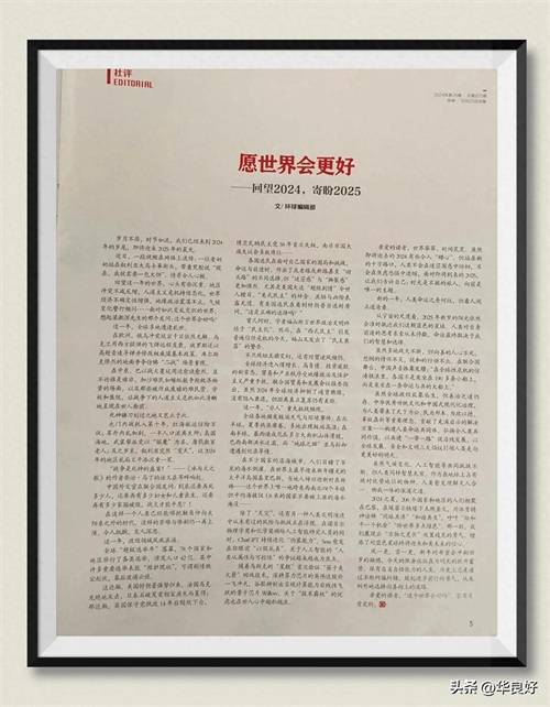 今天在图书馆抽出阅读,有点感叹。这是《环球》杂志2024年最后一期以“愿世界会更好”为题发的社评,社评在归纳2024年世界政治经济军事变乱交织的态势时,套用了中国著名作家梁漱溟先生的反问“这个世界会好吗?”同时以“愿世界会更好”为标题对2025年发展作出了肯定。我读了这篇文字,认为“愿世界会更好”的愿景是否太乐观,“这个世界会好吗”的担忧远胜于“愿世界会更好”的愿景。当下世界不确定因素此起彼伏,不断涌动,这个世界还没有一种力量能够震慑世界,解决冲突、这个世界没有一种理念能够成为人类共同价值观,要实现“愿世界会更好”愿景之难要有清醒的认识。当下,我们要做的事就是要多讲困难以增强危机意识、就是要把我们自己的事做好,筑牢防火墙,防止事态发展到不可收拾的地步,影响我们的发展。